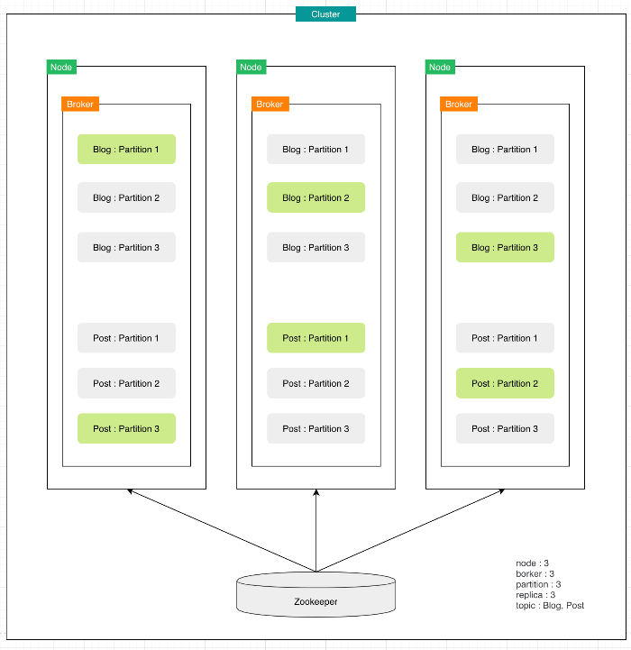 Borker란 카프카 서버를 말하며 동일 Node에 여러 Broker서버를 띄울 수 있습니다.