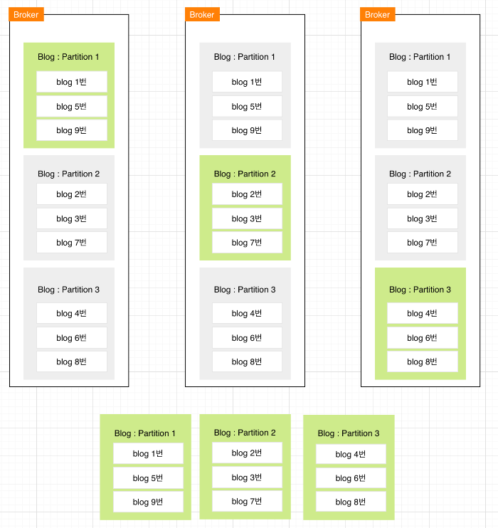 파티션에 저장된 메세지를 살펴보면 개별 파티션에는 순차적으로 데이터가 저장되지만 3개의 파티션을 모아서 살펴보면 데이터의 순서가 보장 되지 않습니다. 예시로 Blog Partiton 1의 메세지는 1, 5, 9이지만 Blog Partiton 1~3 전체의 메세지 순서를 보장되지 않습니다.